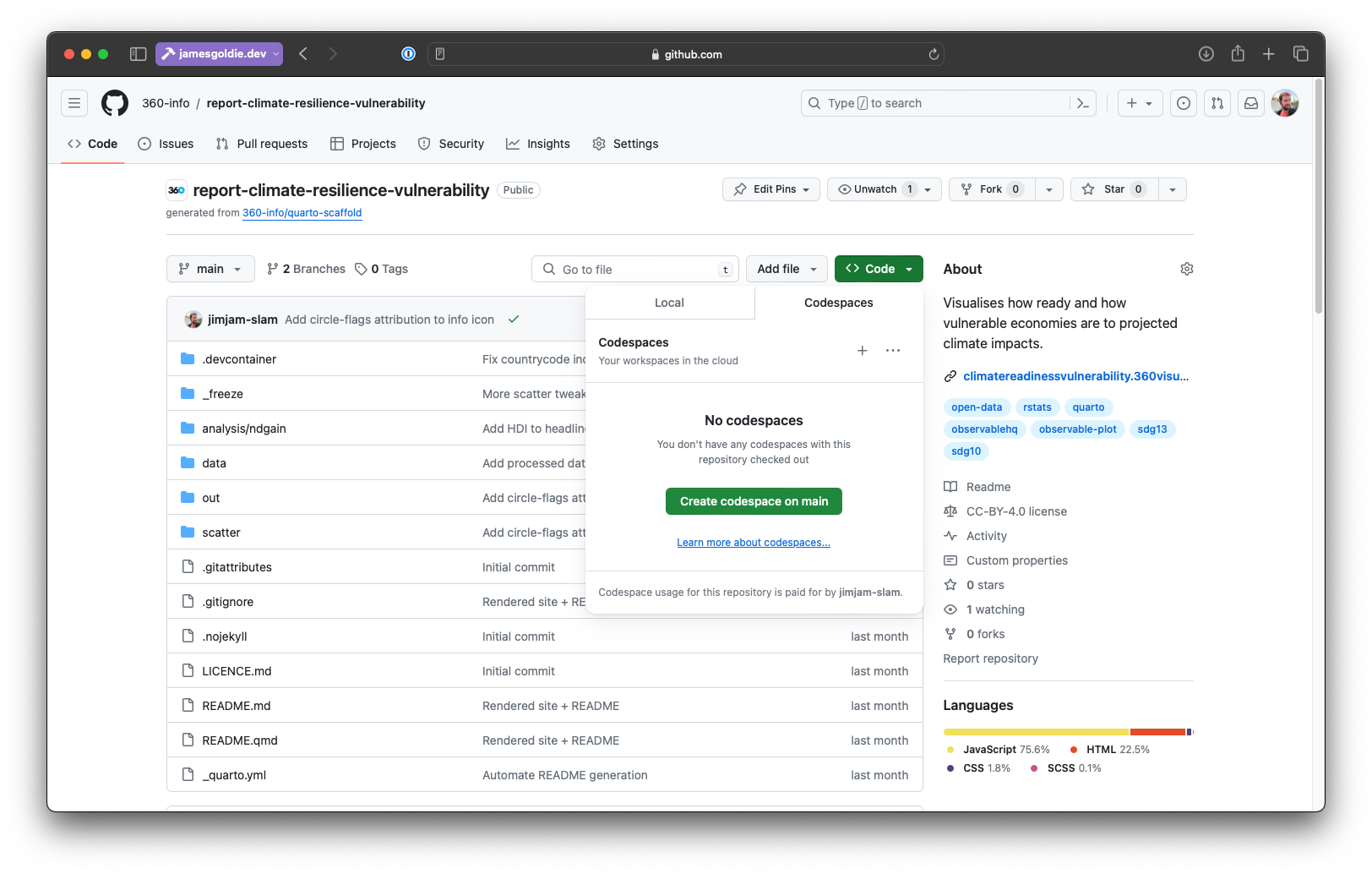 A 360info GitHub repo with the Codespaces menu visible