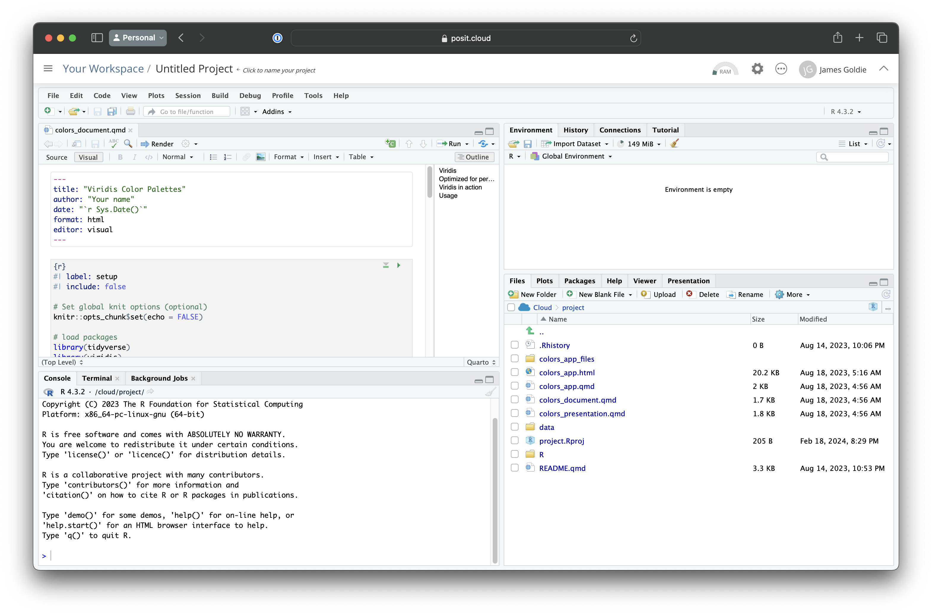 A screenshot of RStudio running in the browser via Posit Cloud